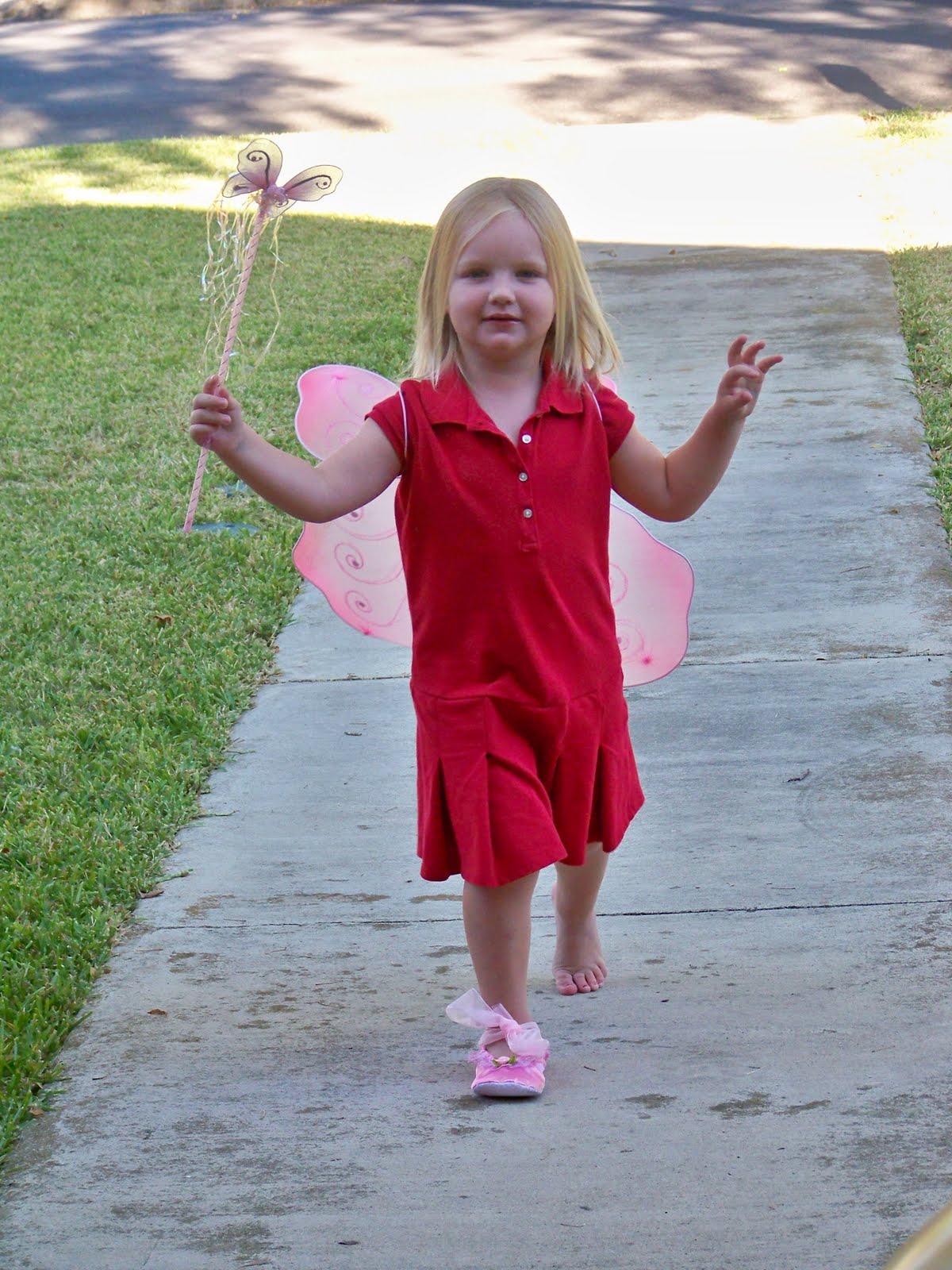 Kennedy trying on her Strawberry Shortcake outfit that Nana made. She wanted to wear the wig to bed and slept with her new pink shoes.
